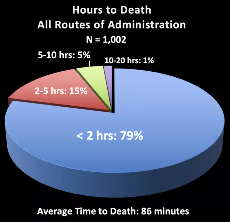 The rectal route of self-administration of aid-in-dying medications, now involving approximately 1 of every 6 aid-in-dying cases reported to the Academy, is effective. The somewhat longer times to death are of minimal clinical bedside significance.